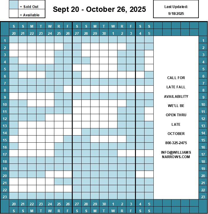 Call 1-800-325-2475 or email info@WilliamsNarrows.com to make reservations!