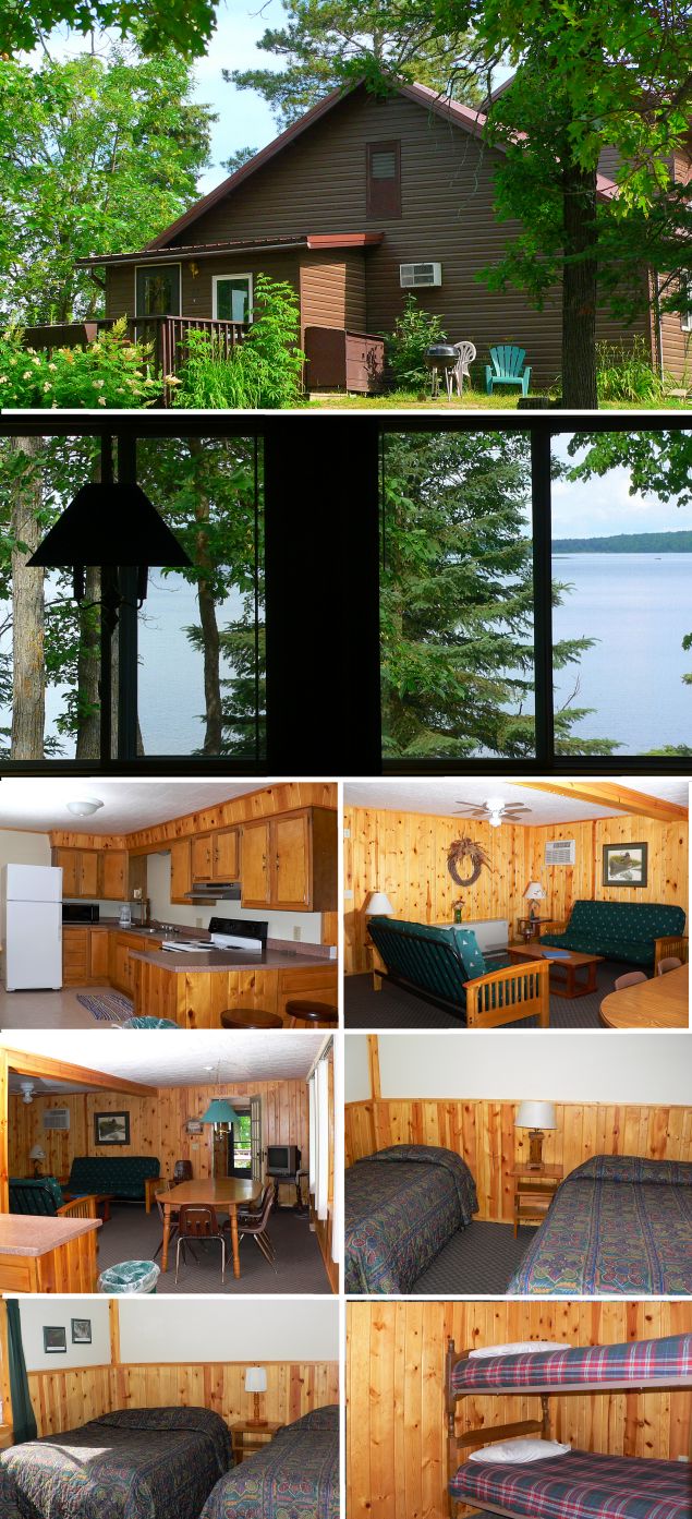 Cabin 13 has 2 bedrooms and a sleeping den with a total of 2 queens, 2 full size and 2 twin beds plus 2 innerspring mattress sleeper futons. The cottage is located on top of a hill on the peninsula and is very close to the lakeshore. The elevated views in this cabin are some of the best on the entire peninsula. The entire Western wall has very large windows that look out at the gorgeous sunsets over Cutfoot Sioux. |