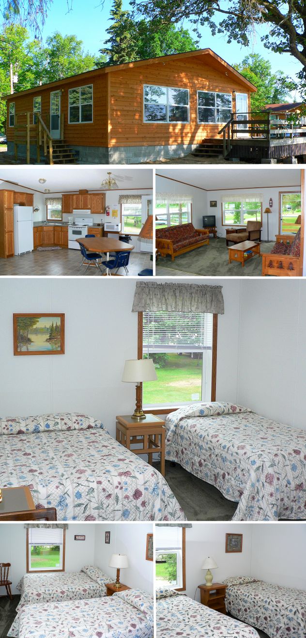 Cabin 19 has 2 bedrooms with a sleeping den for a total of 4 twins and 2 full size beds plus 2 innerspring futon sleeper couches.  The cottage has great lake views of the east bay and is located only 25-30 feet from the lakeshore and docks.